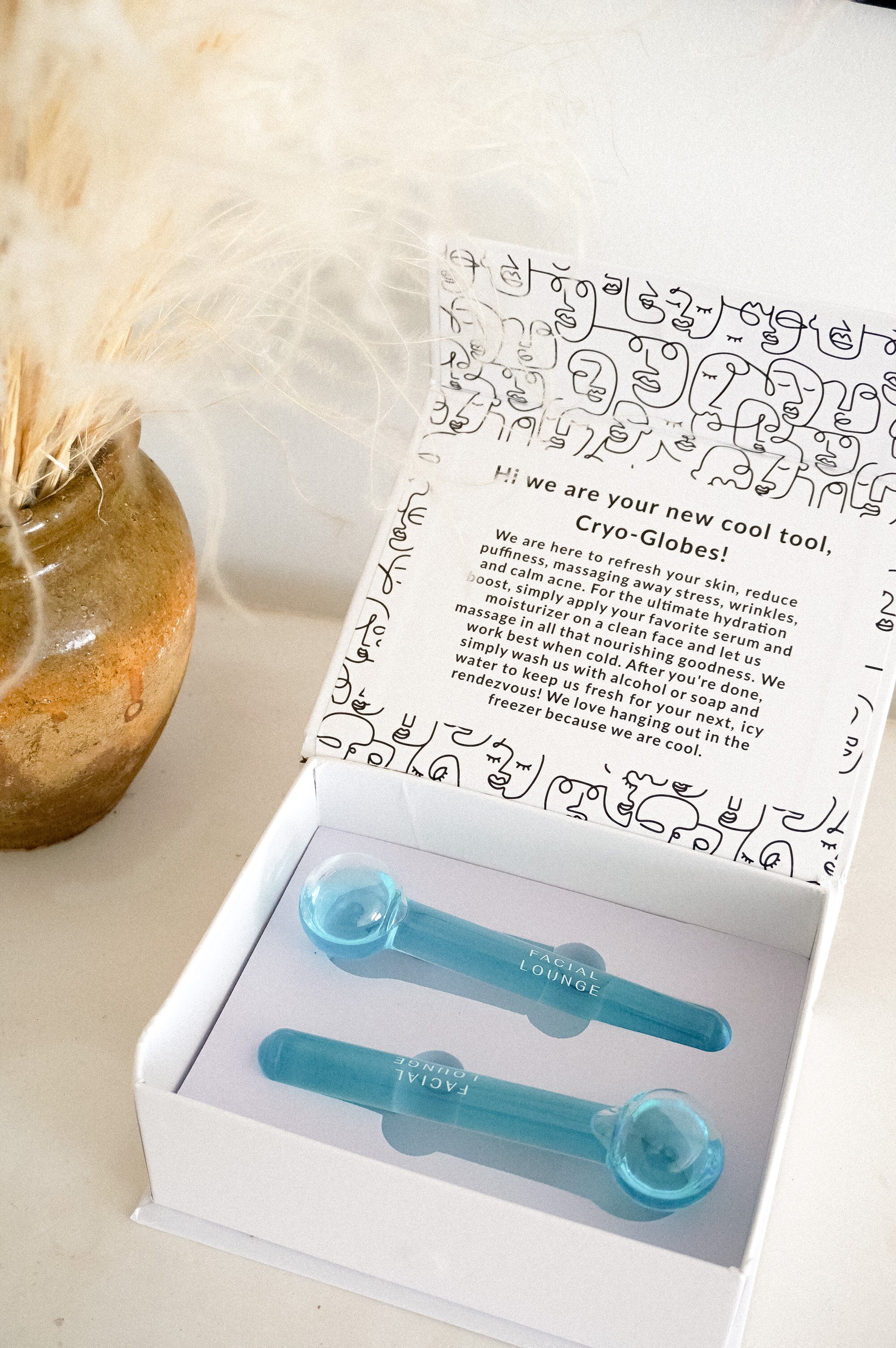 Cryo Globes are facial globes that eliminate puffiness, especially around the eyes, reduce oiliness, ease acne and give your skin the perfect healthy glow. Take Facial Lounge skincare routines to the next level and use them after washing, but before moisturizer. Cryo Globes are made of glass containing cold liquid, the perfect materials! Place them in the freezer then enjoy!