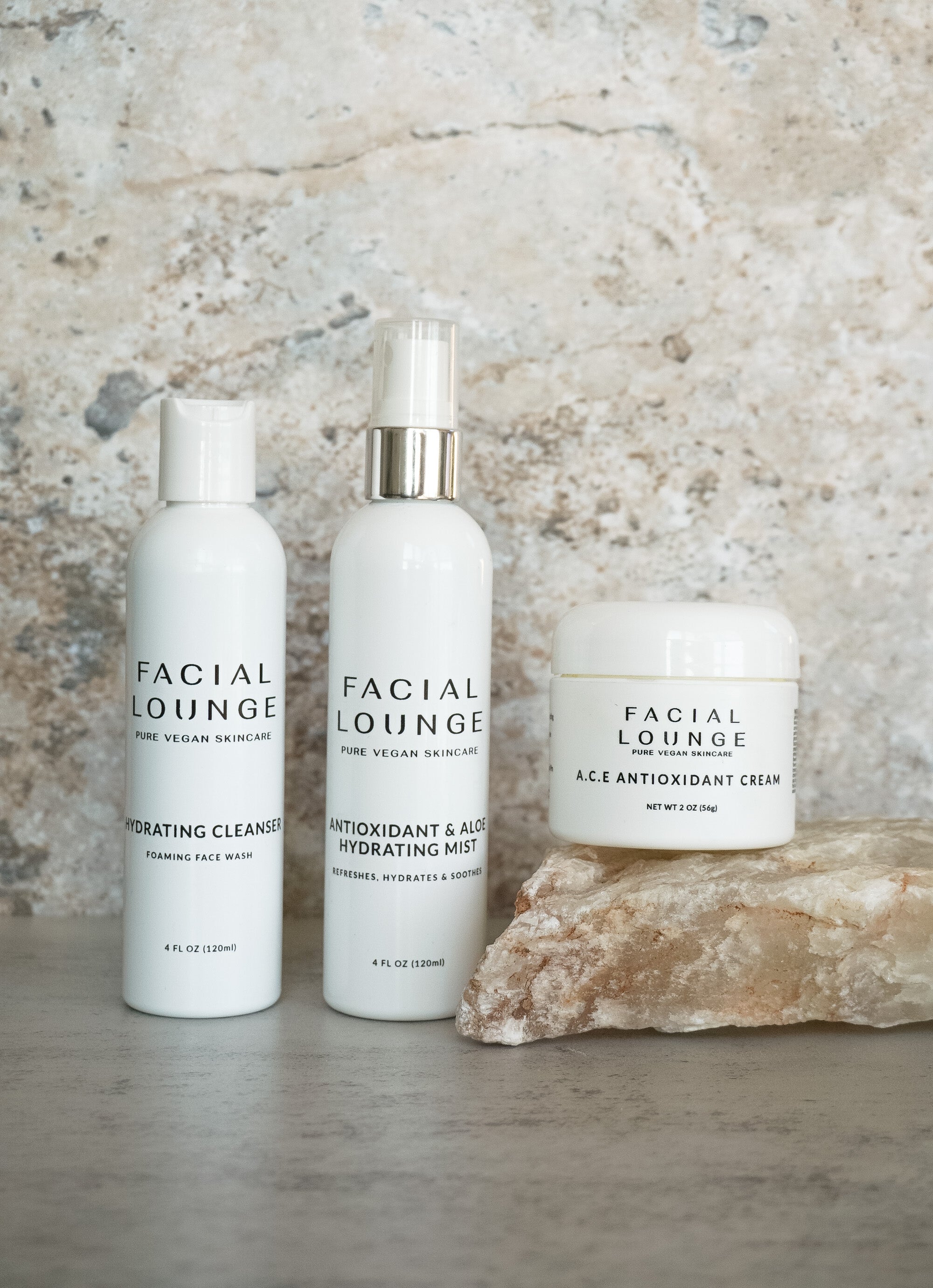 Give the gift of healthy, radiant skin! This kit includes the Hydrating Cleanser, Antioxidant & Aloe Mist, and A,C,E Antioxidant Cream—everything needed to cleanse, refresh, and nourish every skin type this season. Includes a Facial Lounge travel bag.
